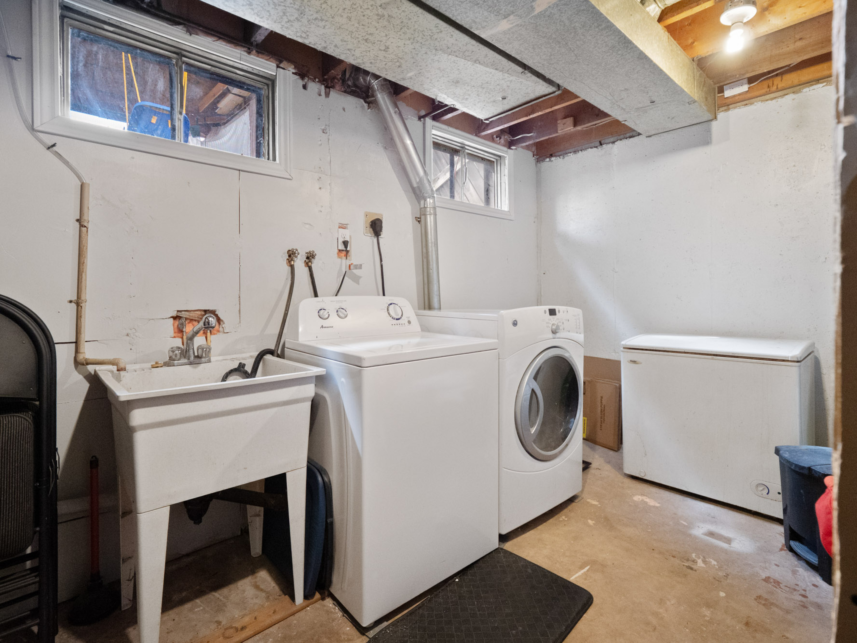 The basement is partially finished adding extra living space with a cozy rec room and laundry area.